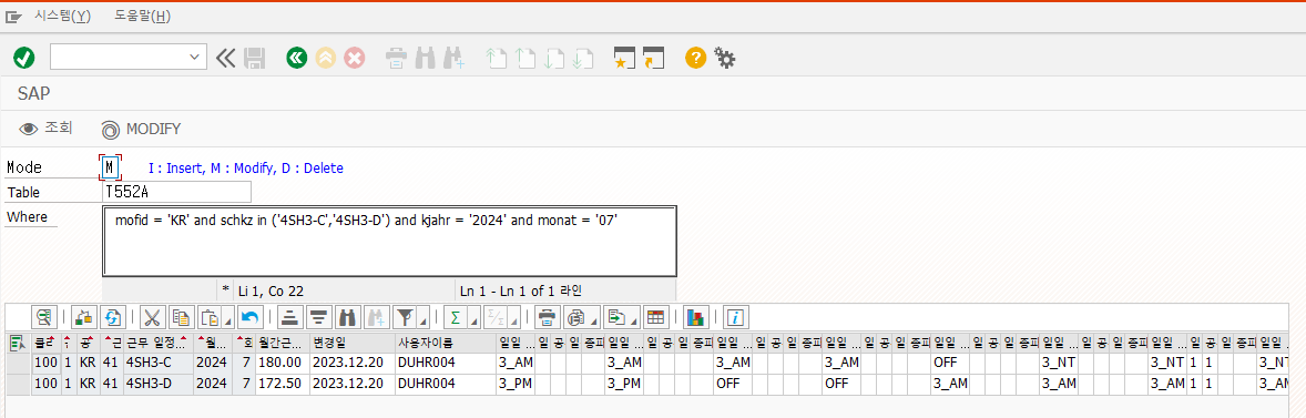 근무조 달력에 휴일을 강제로 추가해야 할 상황이 발생한다. 혹은 잘못된 일일근무일정이 들어가 있어 테이블 수정이 불가피한 경우 T552A 테이블을 강제로 수정한다. 스탠다드 이기 때문에 각 회사의 내규에 맞게 수정하면 된다.
